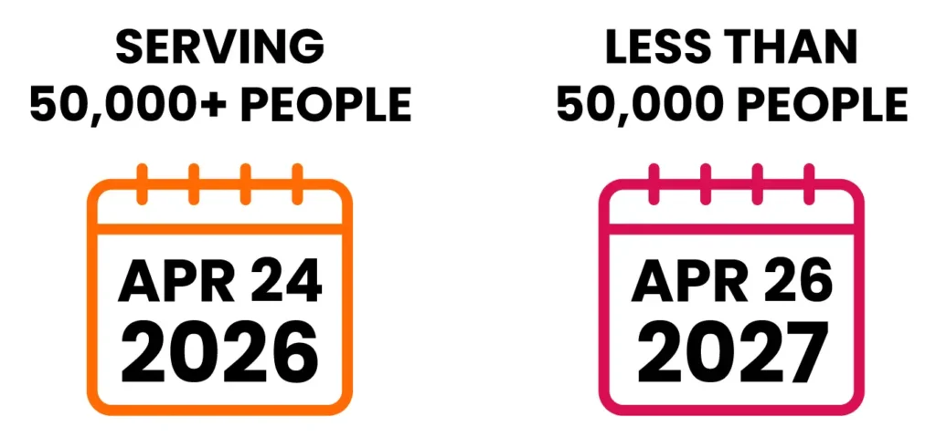 - Two-year deadline: Most entities must comply by April 24, 2026. Smaller agencies with fewer than 50 employees get an extra year.