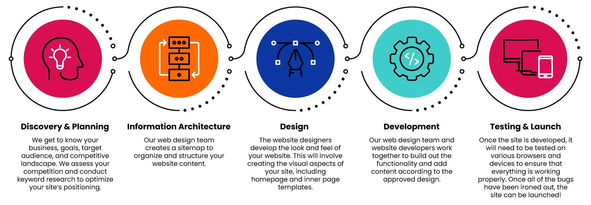 - Development – Our web design team and website developers work together to build out the functionality and add content according to the approved design.
